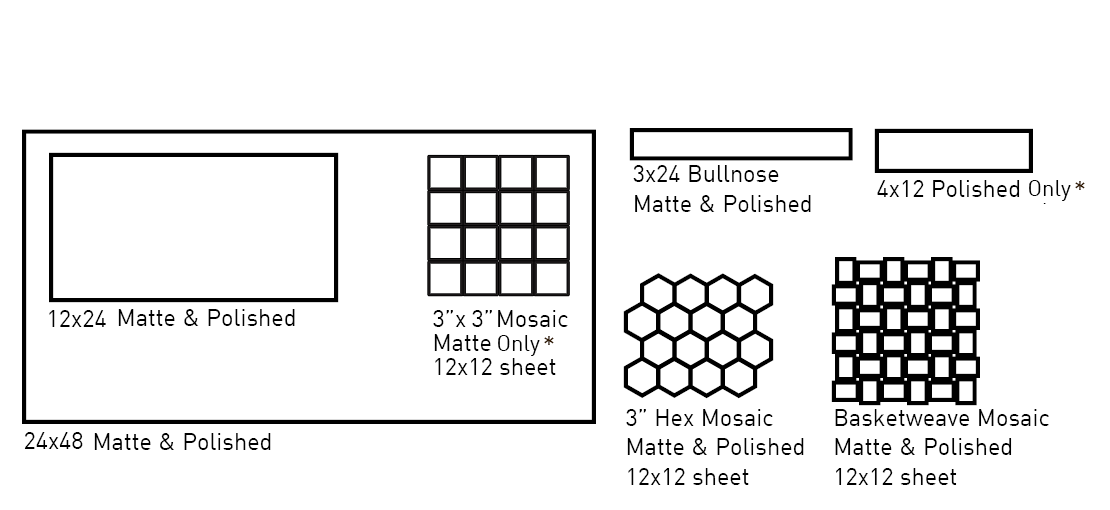 12×24, 24×48, 4×12, 3" Hex Mosaic (12×12 sheet), Basketweave Mosaic (12×12 Sheet)