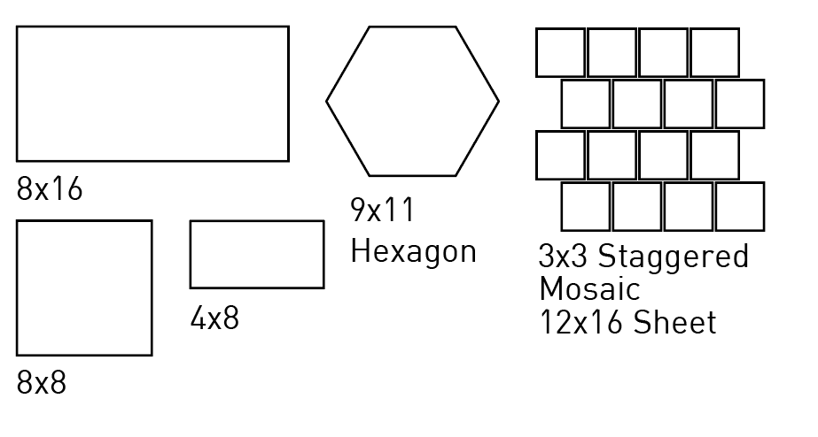 | Sizes | 8×16, 8×8, 4×8, 9×11 Hex, 3×16 Bullnose, 3×3 Staggered Mosaic (12×16 Sheet). |