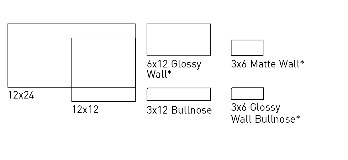 | Sizes | 12×24, 12×12, 3×12 Bullnose, 6×12 Glossy Wall*, 3×6 Matte Wall*, 3×6 Glossy Wall Bullnose* |