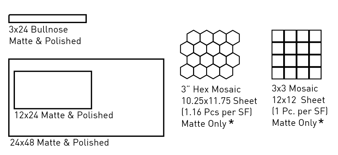 12×24, 24×48, 3" Hex Mosaic, 3×3 Mosaic, 3×24 Bullnose