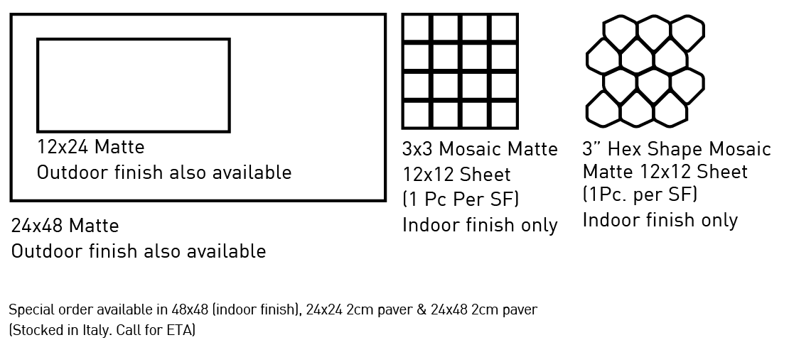 | Sizes | 12×24, 24×48, 3×3 mosaic, 3" Hex Shape Mosaic |