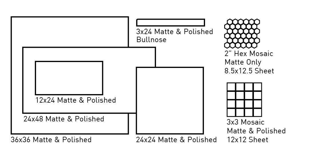 | Sizes | 24×48, 36×36, 24×24, 3×24 Bullnose, 3×3 Mosaic |